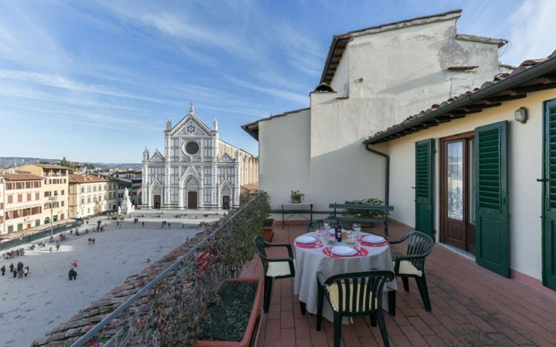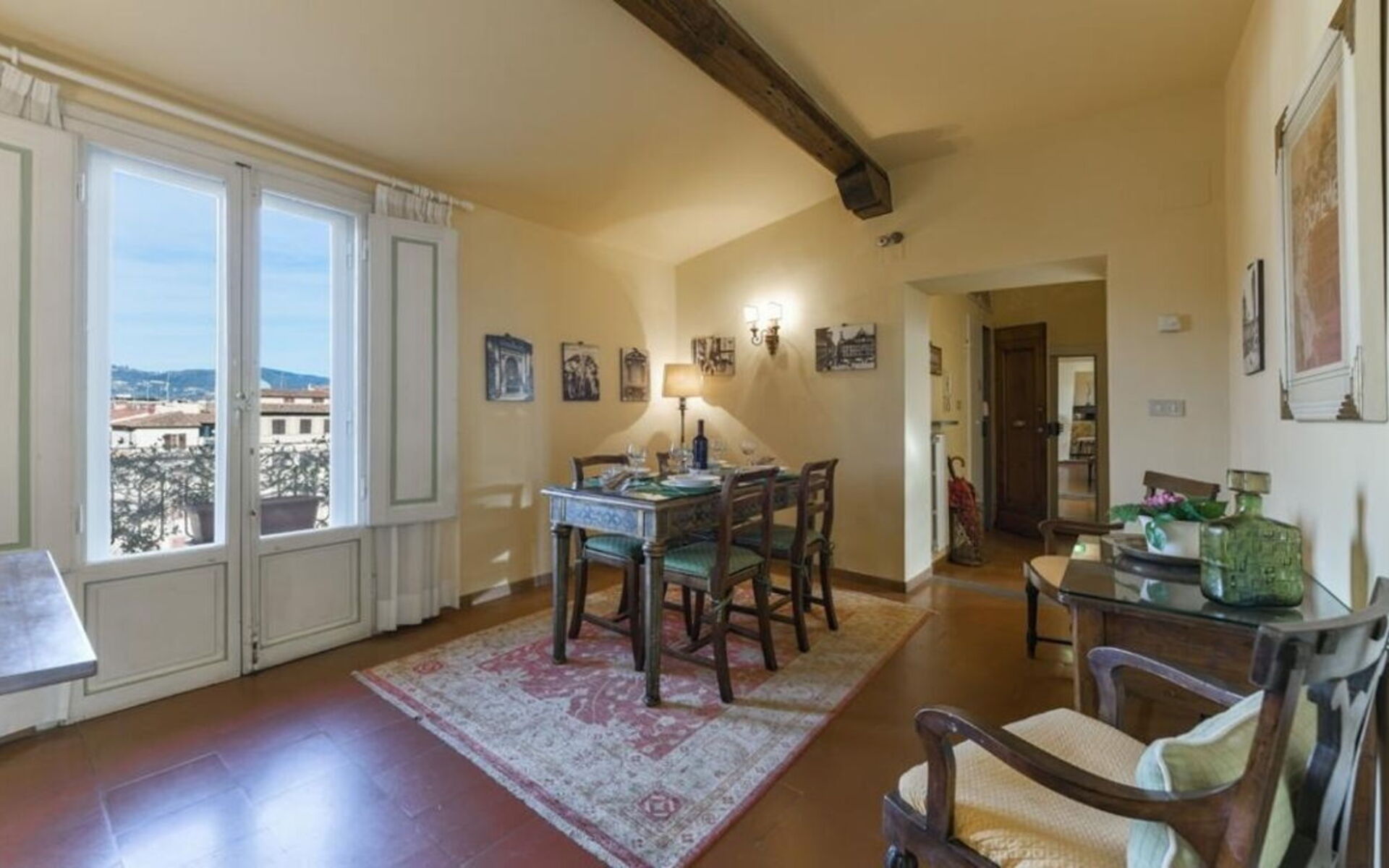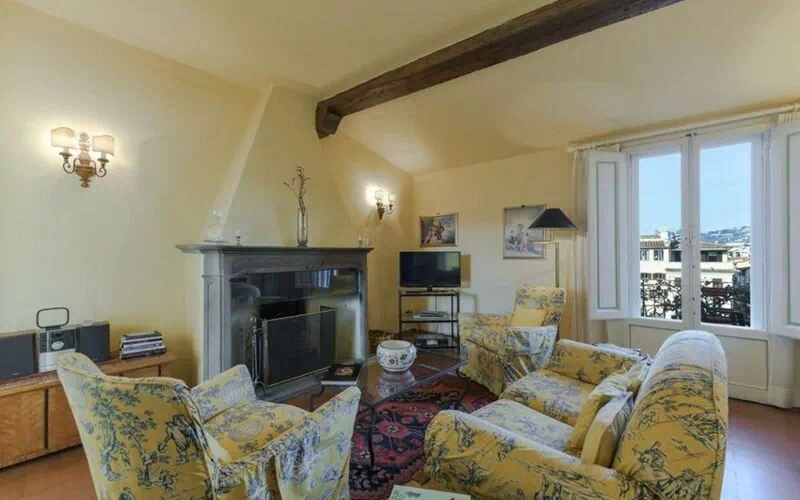 The living room has direct access to a spacious terrace furnished with outdoor table and chairs which offers a stunning view over the Square.