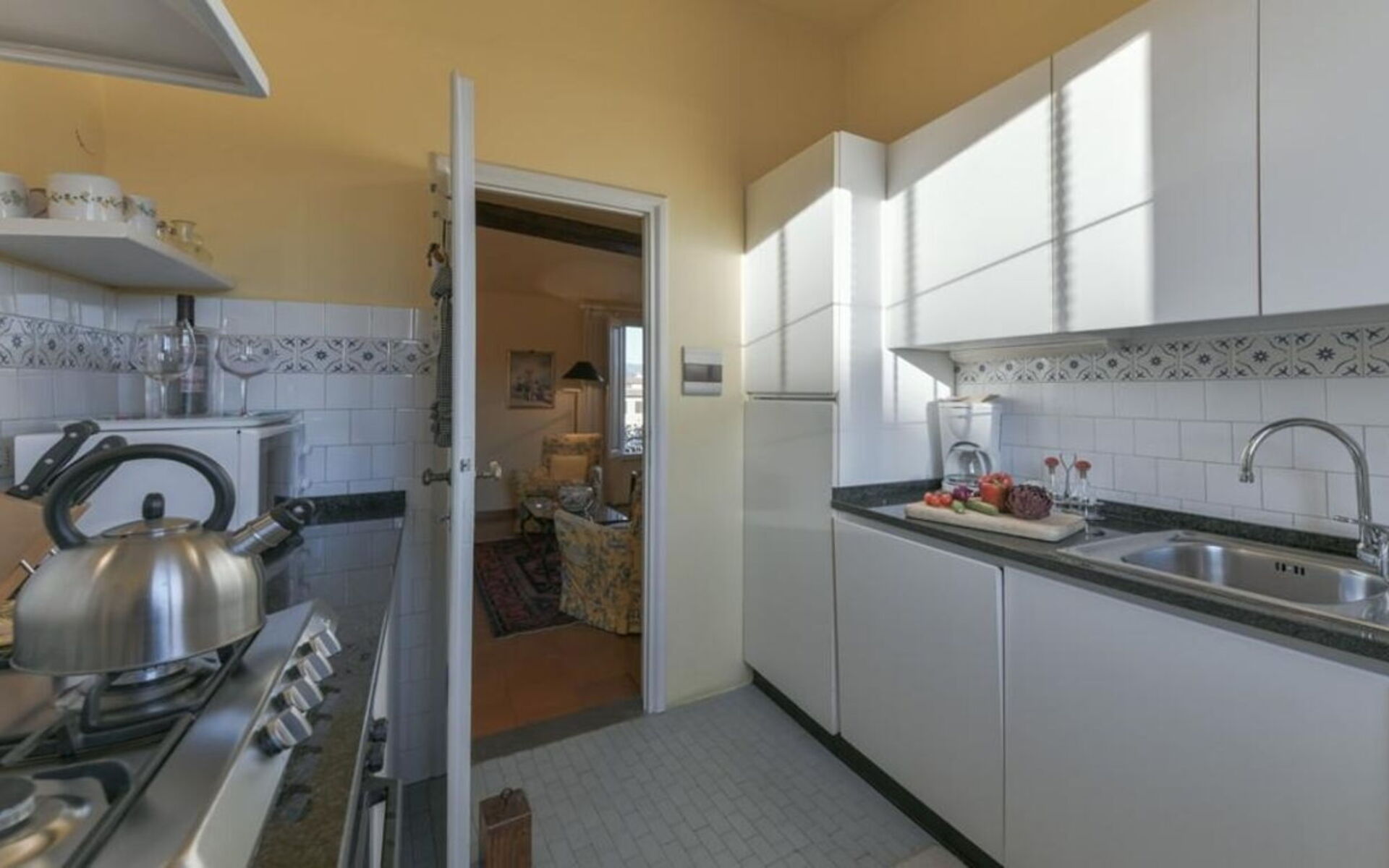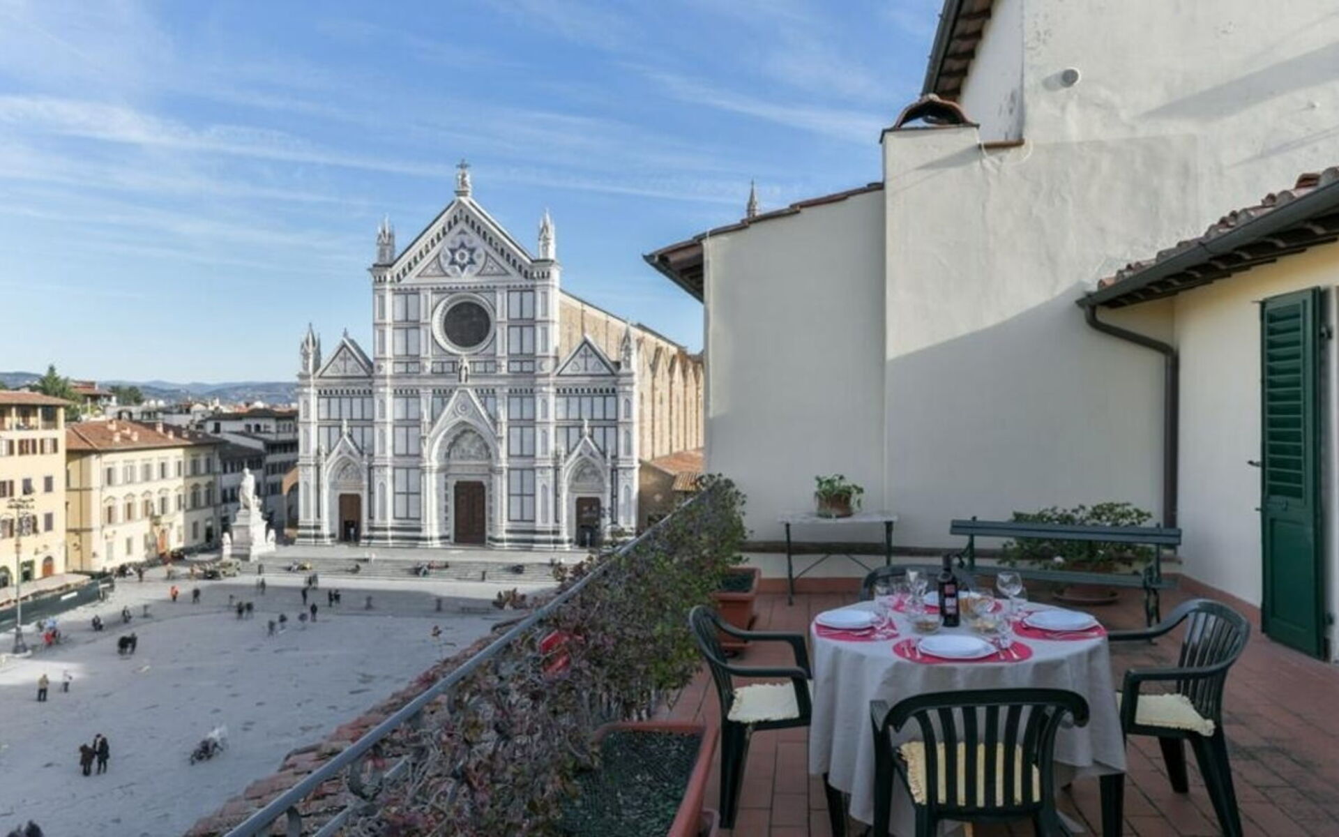 On the left there is a modern and well equipped kitchen. The living room has direct access to a spacious terrace furnished with outdoor table and chairs which offers a stunning view over the Square.