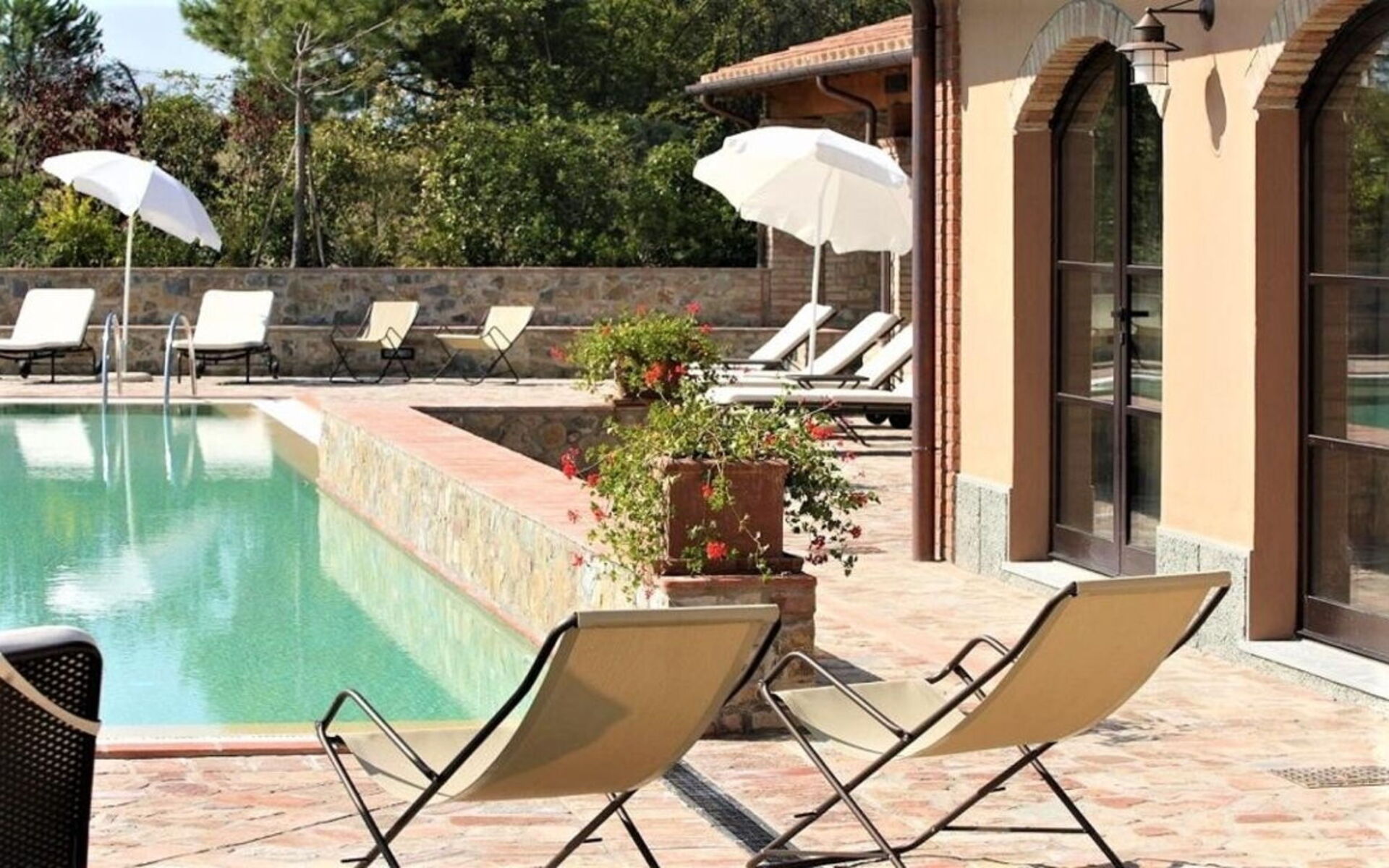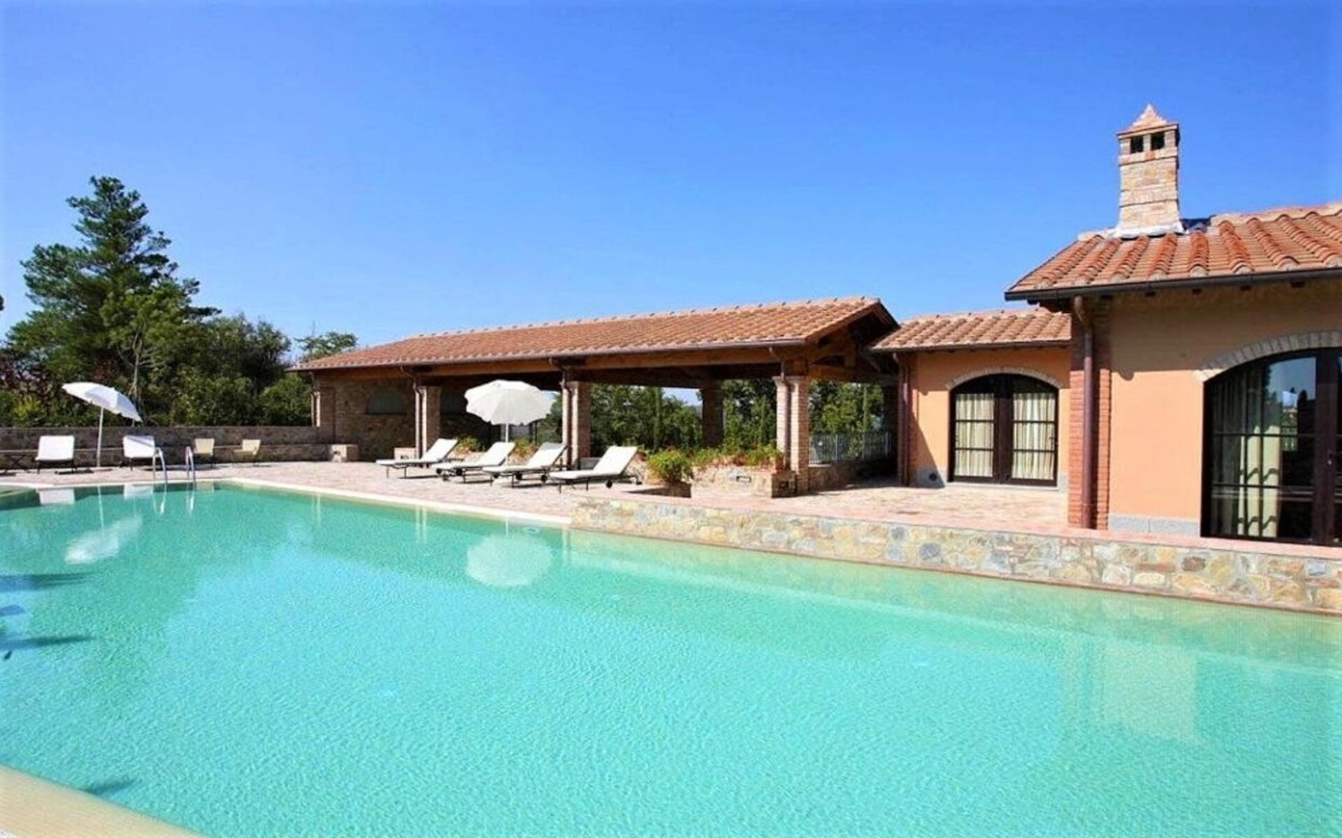The property has a private fenced garden, consisting of large areas paved in terracotta and stone, flower beds and lawn areas. The large loggia is equipped with a dining table and barbecue, ideal to spend alfresco lunches and dinners. The outdoor spaces are embellished by a lovely swimming pool, irregularly shaped (7 x 21 m, the depth varies from 1.2 to 2.5 m), equipped with deckchairs, parasols, sunbeds and hydromassage area.