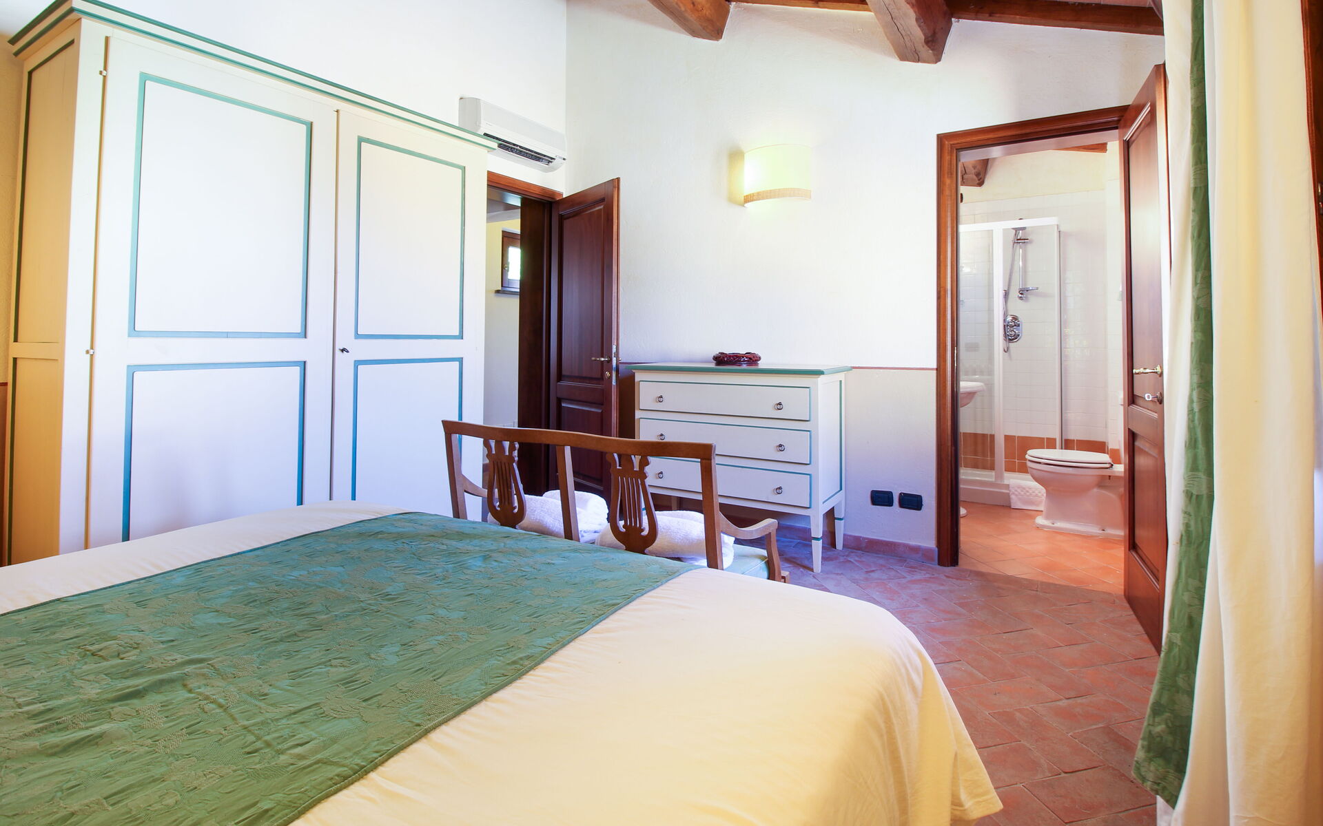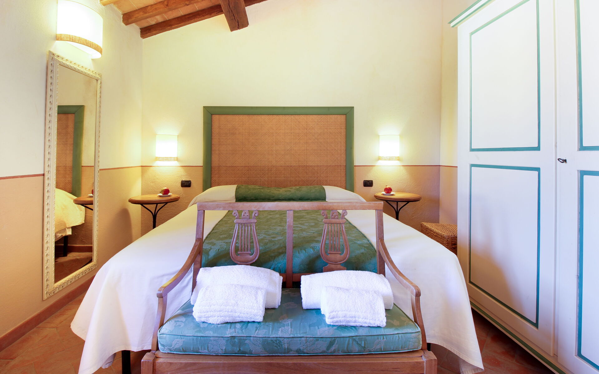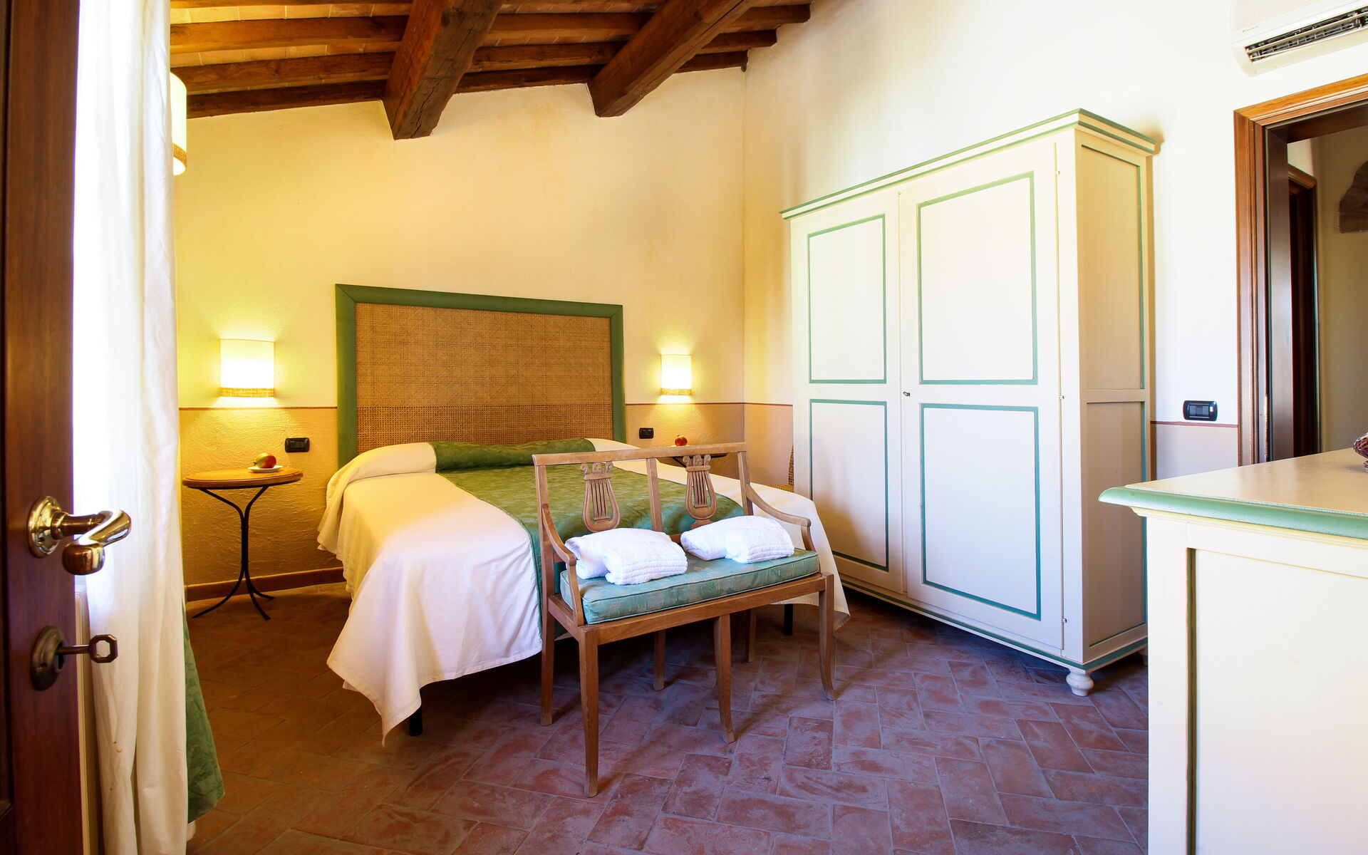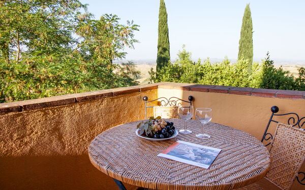 Maggiorana Suite (4 people): located on the first floor, offers a beautiful view of the countryside and the swimming pool, accessed via an independent staircase. It consists of: living room, kitchenette, 1 double bedroom, 1 single bedroom with 2 beds. Each room has its own bathroom with shower.