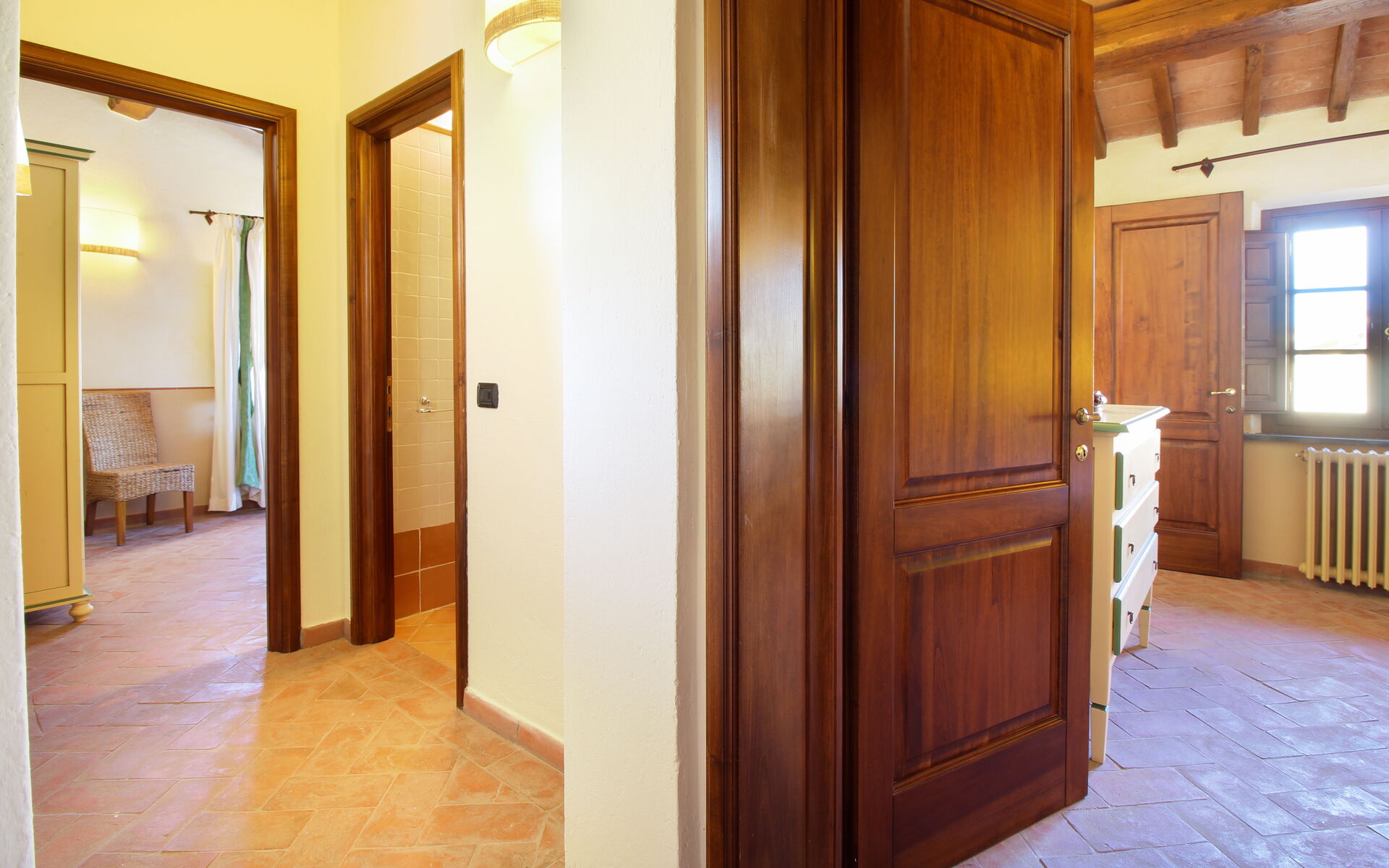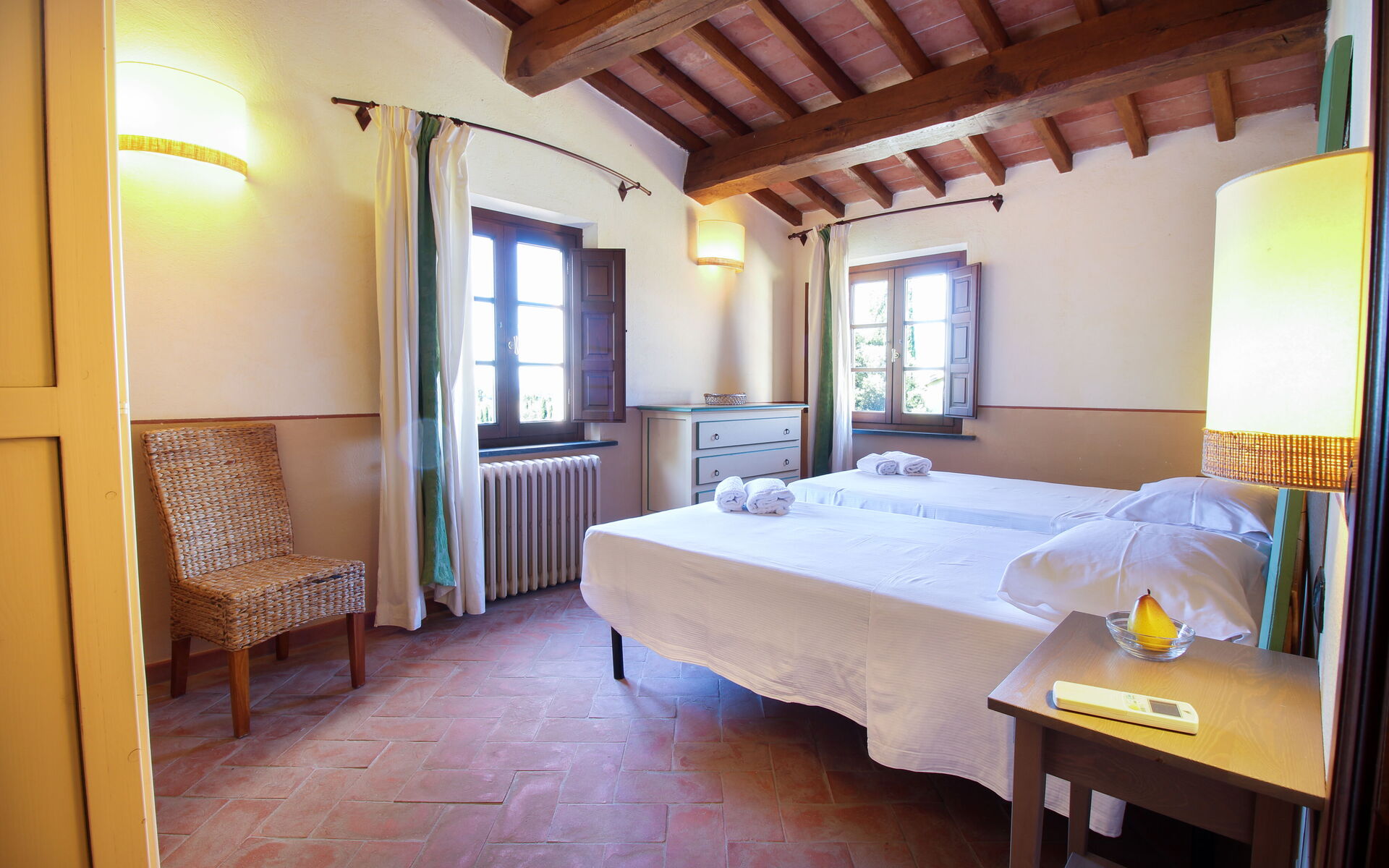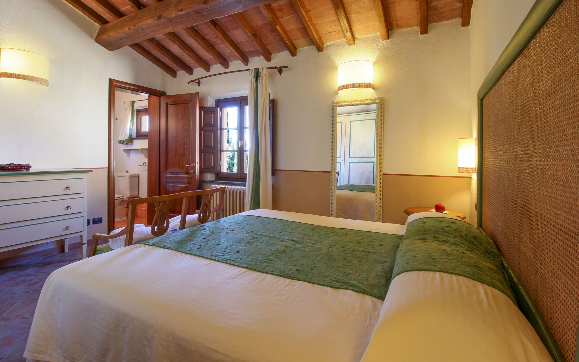 Malvarosa Suite (4 people): This apartment is also located on the first floor, offers a beautiful view of the countryside and is accessed via an independent staircase. It consists of: living room, kitchenette, 2 double bedrooms with private bathroom with shower.