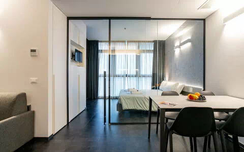 Cozy 45 m² apartment, bright and furnished with high‑quality materials, ideal for those seeking a contemporary, comfortable space with a distinctive character. Large windows offer a beautiful panoramic view of the city and enhance the modern interiors, creating a superior‑quality stay.