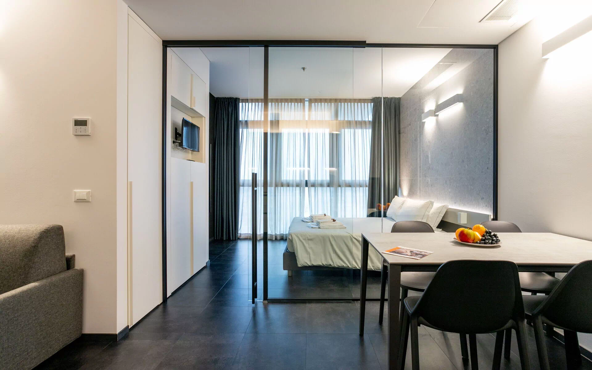 • Bedroom featuring a full glass wall and glass door—a bold and refined design detail that creates playful transparency and gives the space a uniquely intriguing vibe