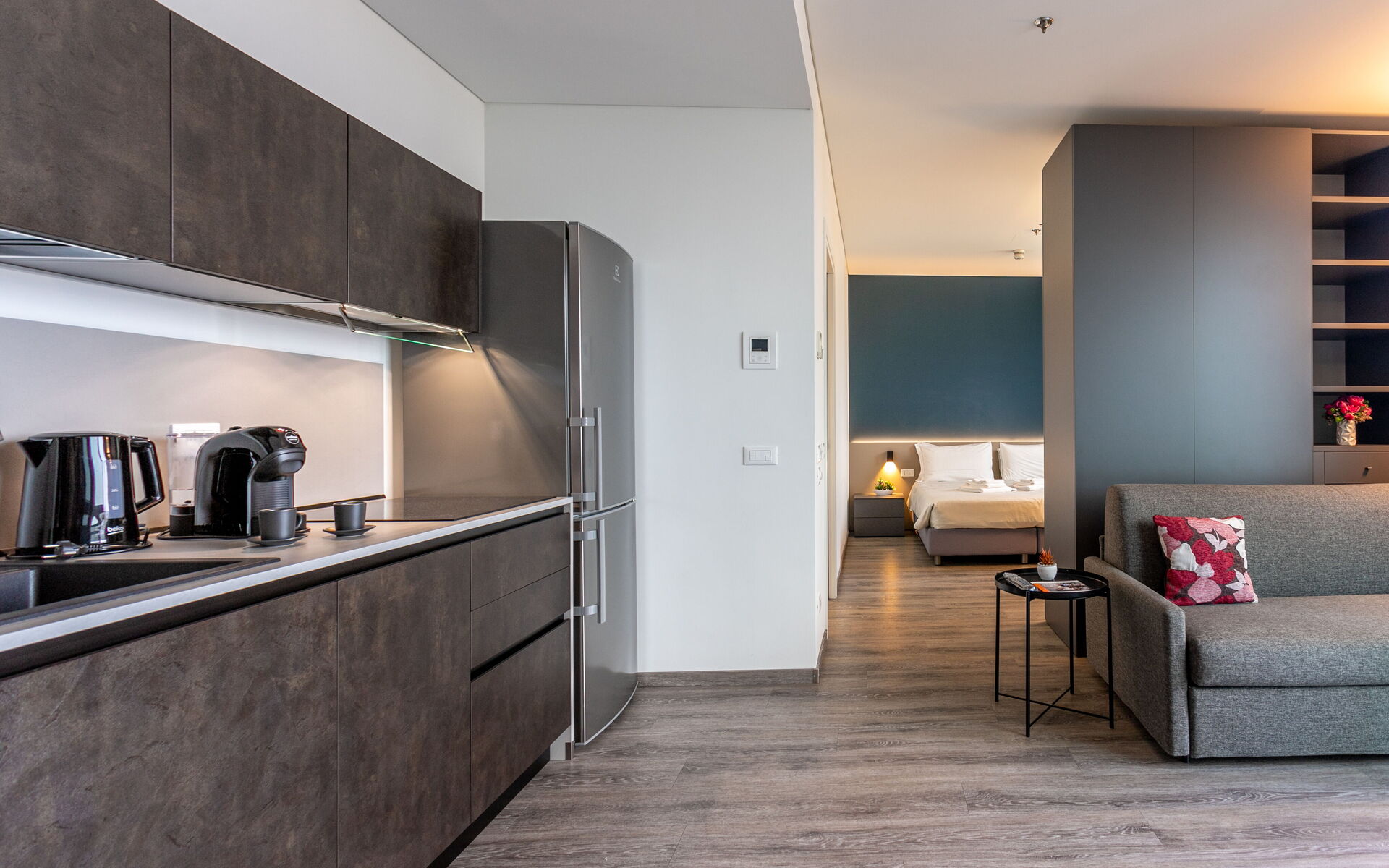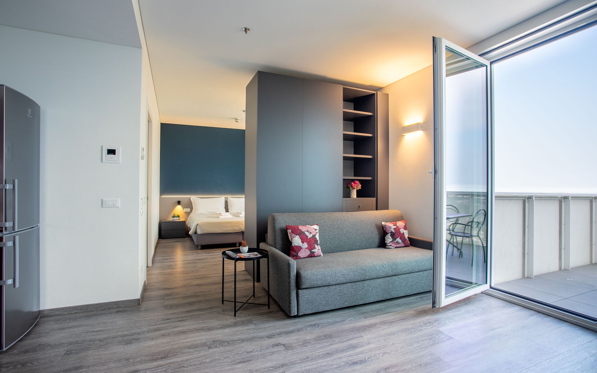 Cozy 45 m² loft, bright and elegantly furnished, ideal for those seeking a modern stay with superior comfort. The large windows and the beautiful 12 m² furnished terrace, situated on an elevated level—offer a breathtaking view of Venice and the entire lagoon from above, a rare and privileged perspective that few accommodations can provide.